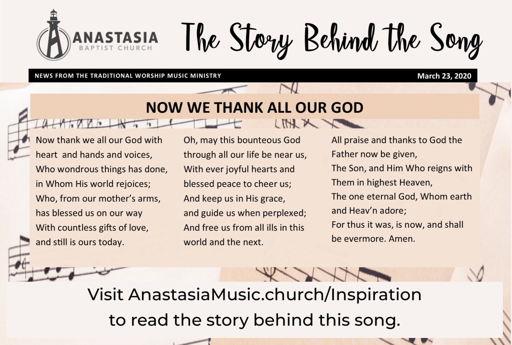 Know that I’m thinking of you and praying for you even though we aren’t meeting in person for the present time. I value you as members of the traditional worship ministry teams, not because of your singing or playing ability (I do appreciate that—don’t get me wrong!) but because of who you are. As the apostle Paul wrote to the church at Thessalonica, “since we were torn away from you, brothers, for a short time, in person not in heart, we endeavored the more eagerly and with great desire to see you face to face” (1 Thessalonians 2:17). So for now, as we meet “screen to screen,” let’s hold each other up with messages, emails, texts and phone calls. And when this is all over, we’ll come back together, joining hearts and hands and voices, to thank we all our God!