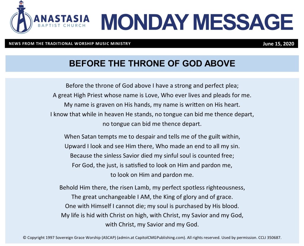 There’s an old saying, “Whenever Satan reminds you of your past, just remind him of his future” (spoiler alert: see Revelation 20:10—it doesn’t end well for the devil). “Before the Throne of God Above” is a song of great assurance. It declares the certainty of God’s love and provision in the here and now, and the security of His beloved forevermore. So if virus or violence leads you to despair, look up and see Jesus, “a great High Priest whose name is Love,” and know that, if you’ve accepted His offer of salvation, “[your] name is graven on His hands, [your] name is written on His heart,” “[your] sinful soul is counted free,” “[your] soul is purchased by His blood,” and “ [your] life is hid with Christ on high.”