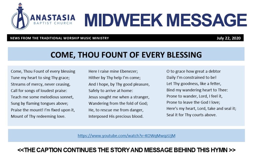 Robert Robinson has been dead for almost two and a half centuries, yet his song lives on. In 2005, Thomas Miller wrote a new second stanza and added a chorus to produce “Come Thou Fount, Come Thou King” (click here to hear that version) and a whole new generation of believers is having its heart tuned to sing of God’s grace. Let’s join our voices in songs of loudest praise!