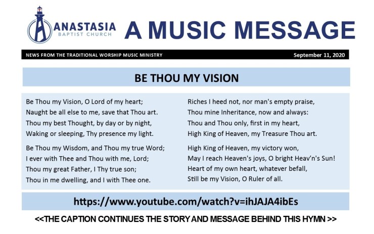 The text of “Be Thou My Vision” is an entreaty spoken by a worshiper to God, asking to be transformed. The desired change is summarized by the opening words, “Be Thou my Vision, O Lord of my heart.” In this world, many competing commitments vie for our focus and allegiance; the first stanza turns our sight to the only appropriate loyalty for a child of God, which is God Himself. In the Amplified Bible, Hebrews 12:2 speaks of “… [looking away from all that will distract us and] focusing our eyes on Jesus,” a sentiment echoed in the first stanza’s “Naught be all else to me, save that Thou art.”