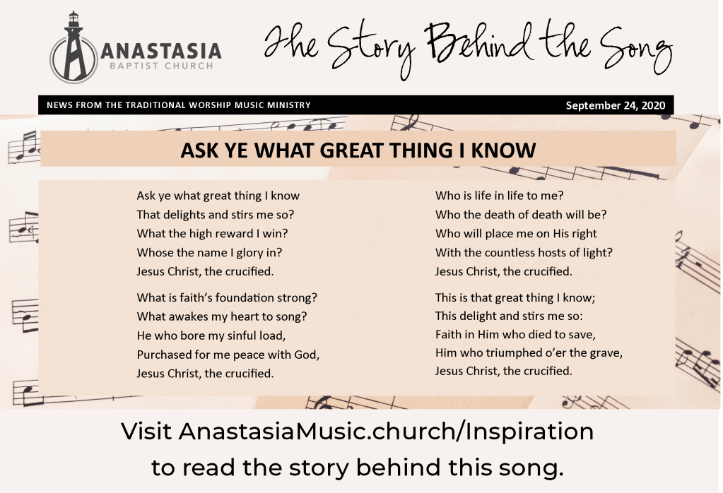 “Ask Ye What Great Thing I Know” falls into that same category of song. It’s comprised of a series of questions that all have the same answer—“Jesus Christ, the crucified.” Although its author wrote more than 500 hymns, only this one remains in common usage.