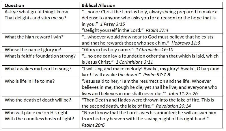 Of the four stanzas of “Ask Ye What Great Thing I Know” that we commonly sing in its English translation, the first three are a series of questions steeped in Biblical references.