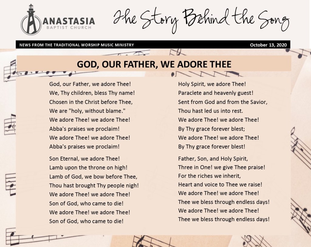 But some hymns have been written that address each of the three Persons of God in separate stanzas and often have a fourth “summary” stanza. One such example is “God, Our Father, We Adore Thee.” Stanzas 1, 2 and 4 were written by George W. Frazer by 1882, for that’s when they were first published in “Hymns of Praise for the Young.” The hymn was reprinted in the United States in 1904 in “Hymns of Grace and Truth” which was published by Loizeaux Brothers. This version did not have a stanza specifically addressing the Holy Spirit.