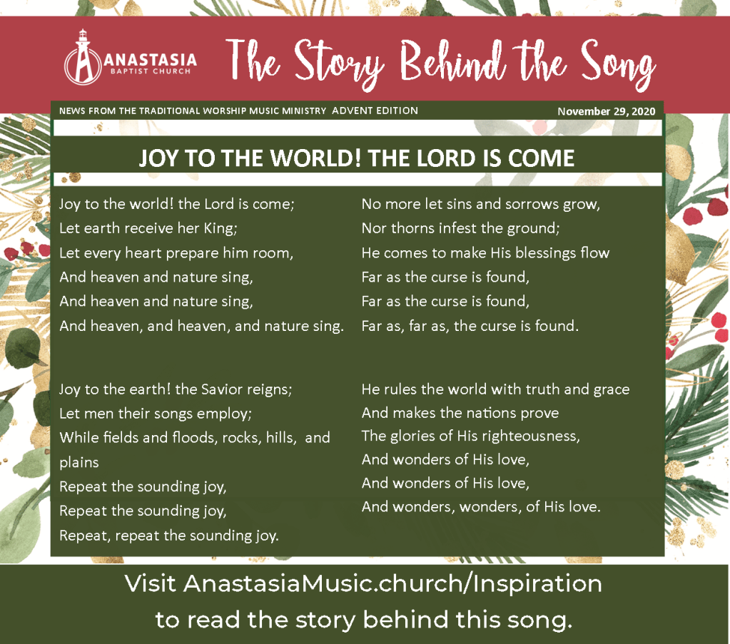 “Joy to the World! The Lord Is Come” is a treasured legacy song of Christianity. Its message of joy still rings just as vibrantly today as it did when first sung three hundred years ago. Current-day pastor and hymn writer Matt Boswell (one of the co-authors of “Christ Our Hope in Life and Death”) wrote, “From the first time this hymn was published . . . to the pews of our churches today, its powerful call to ‘repeat the sounding joy’ continues. The joyful theme we hear in this hymn is two-fold: it is a joy that looks back on the incarnation and one that also looks forward to the second coming of Christ. …We rejoice looking back on the faithfulness of our God, and we also rejoice looking forward to what God has promised in the future. We sing between what is and what will be, the ‘already’ and the ‘not yet’ of our faith.”